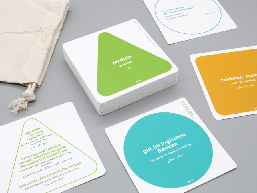 Ein weiterer Vorteil unserer Kompetenzkarten für den Beruf: Alle Karten sind mehrsprachig in Deutsch, Englisch und Arabisch verfügbar. Dadurch ist das Kartenset für ein breites Publikum zugänglich, zum Beispiel in Klassen oder Gruppen mit unterschiedlichen Sprachhintergründen.