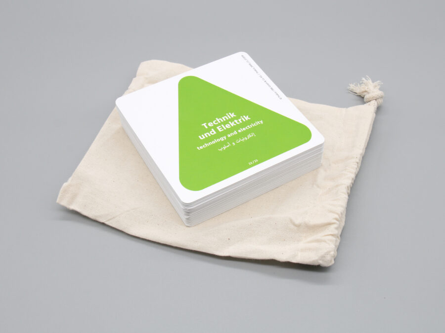 Es enthält Karten aus drei Bereichen, die auf die Selbsteinschätzung in den Kategorien „Ich kann“, „Ich mag“ und „Diese Berufsfelder interessieren mich“ abzielen. Zum Set gehört ein Dokumentationsbogen (A4), der sowohl digital als beschreibbares PDF als auch analog genutzt werden kann. Die Karten sind mehrsprachig in Deutsch, Englisch und Arabisch bedruckt.