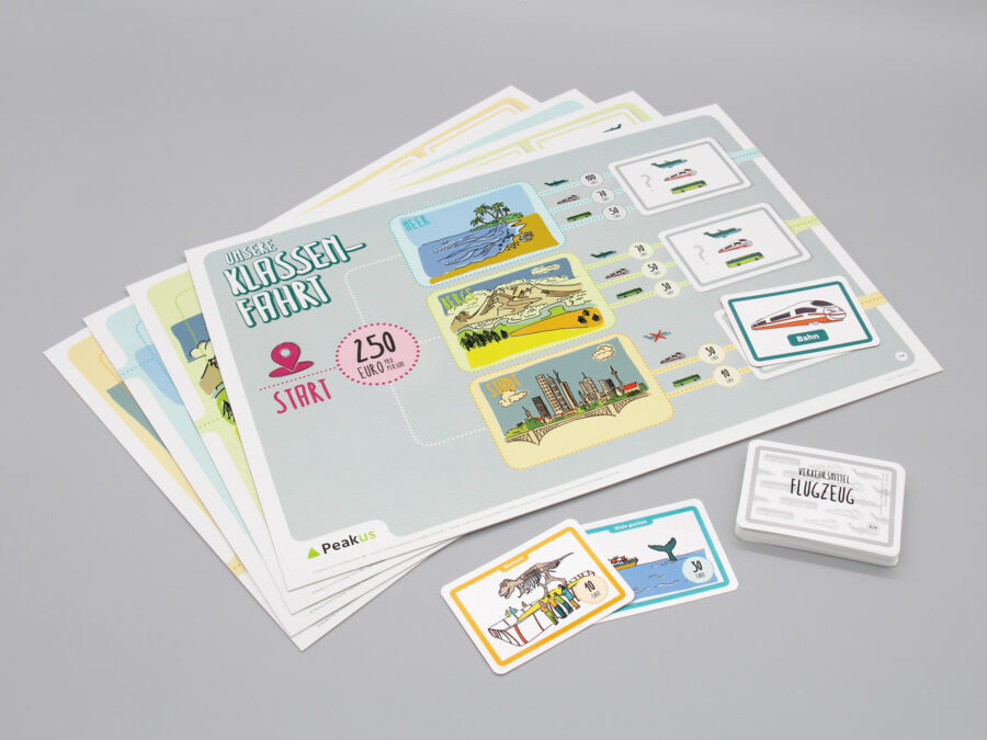 Mit dem Spiel „Klassenfahrt“ lässt sich auf anschauliche Weise die Planung einer Gruppenreise simulieren. Große Spielfelder dienen zur Visualisierung des Reiseziels, während kleine Spielkarten verschiedene Optionen für Transportmittel und Unterkunft bieten. Darüber hinaus können Ideen für Aktivitäten am Urlaubsort diskutiert und unter Berücksichtigung der Kosten gemeinsam demokratisch entschieden werden.