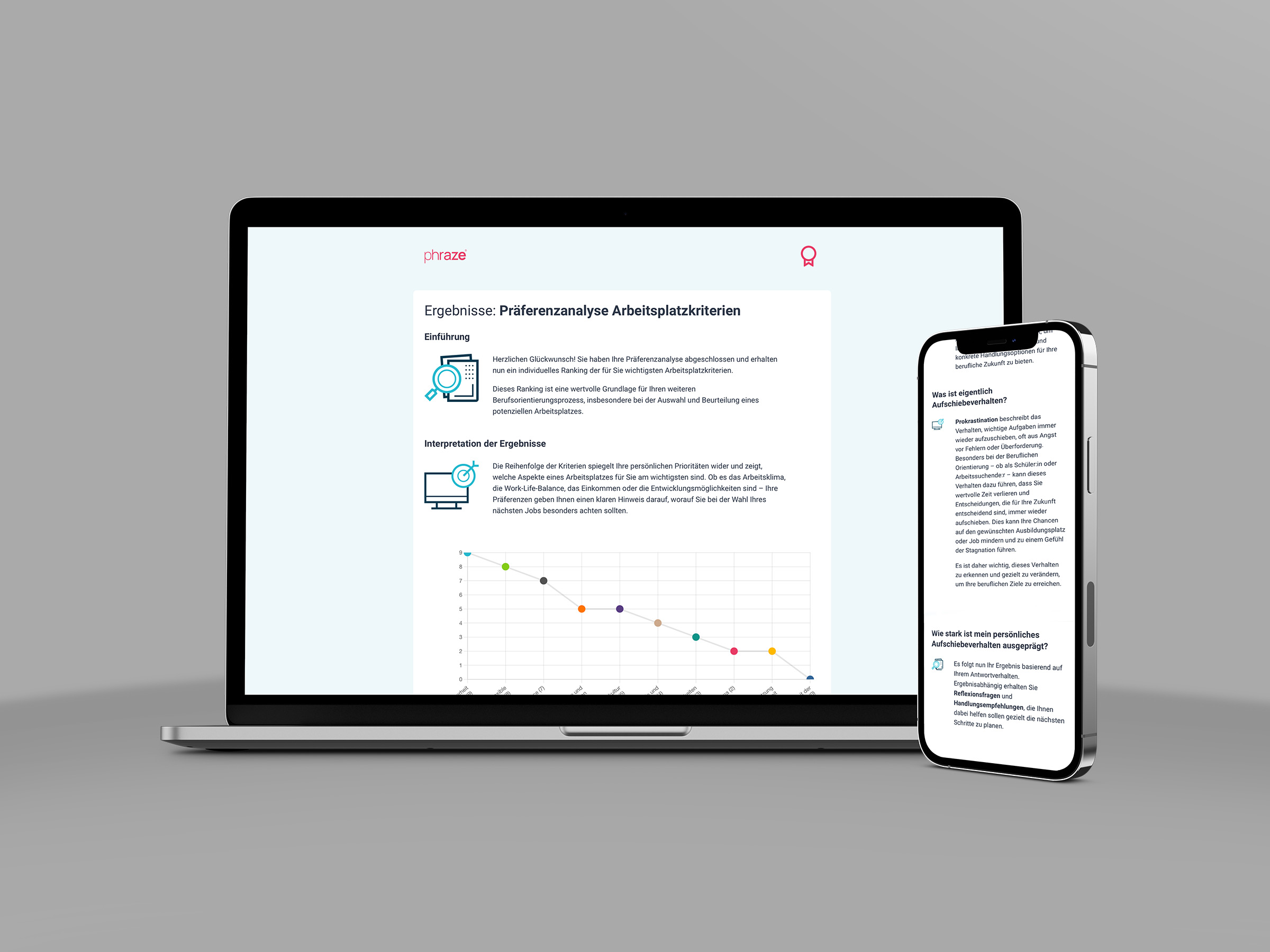 Die Präferenzanalyse unterstützt Arbeitssuchende dabei, herauszufinden, welche übergeordneten Aspekte eines Arbeitsplatzes für sie am wichtigsten sind. Hierzu werden zehn zentrale Arbeitsplatzmerkmale (z.B. Arbeitsklima, Gehalt, Work-Life-Balance, Aufstiegschancen) paarweise verglichen. Durch diesen Vergleich entsteht ein individuelles Ranking, das die persönlichen Prioritäten bei der Jobsuche oder die Vorteile eines möglichen Berufswechsels deutlich macht.