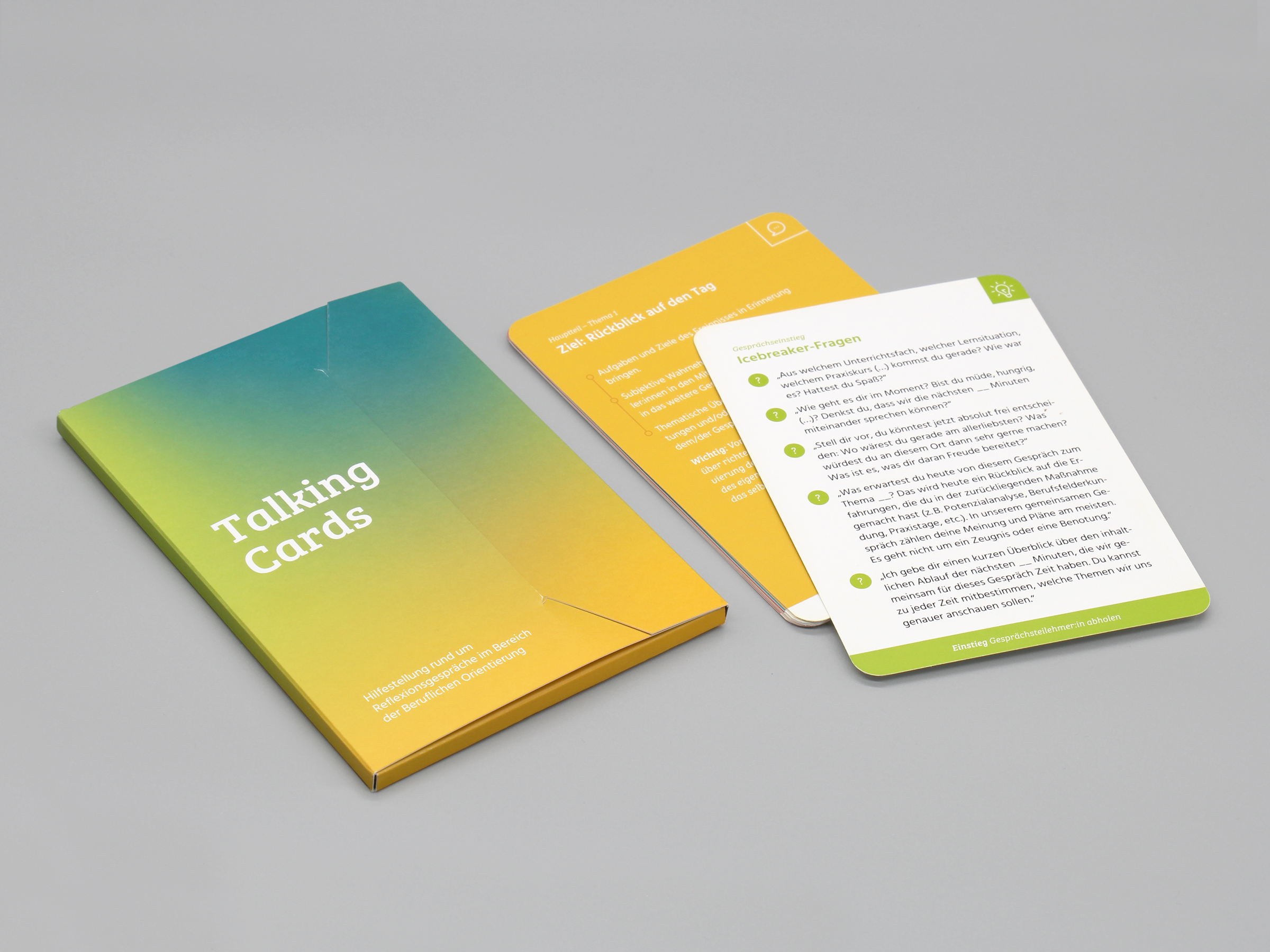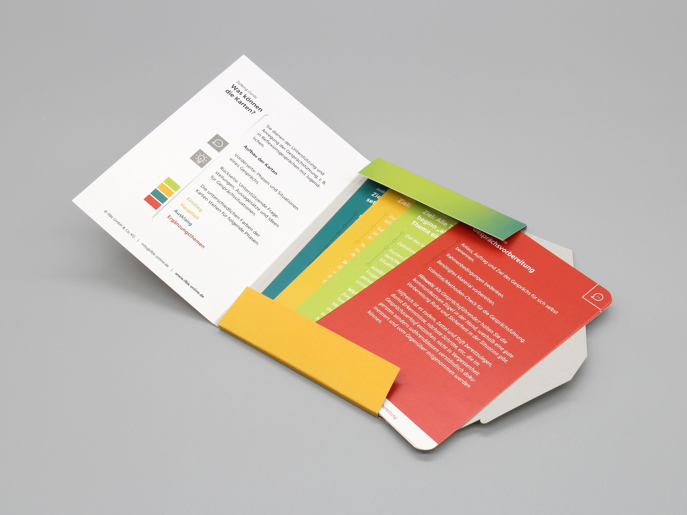 Die Karten sind in drei Gesprächsphasen unterteilt und bieten auf der Vorderseite eine kompakte Übersicht über Ziel und Ablauf der jeweiligen Phase. Auf der Rückseite finden Sie verschiedene Arten an Fragestellungen und Herangehensweisen, die Angebote zum Umgang mit den jeweiligen Situationen machen.