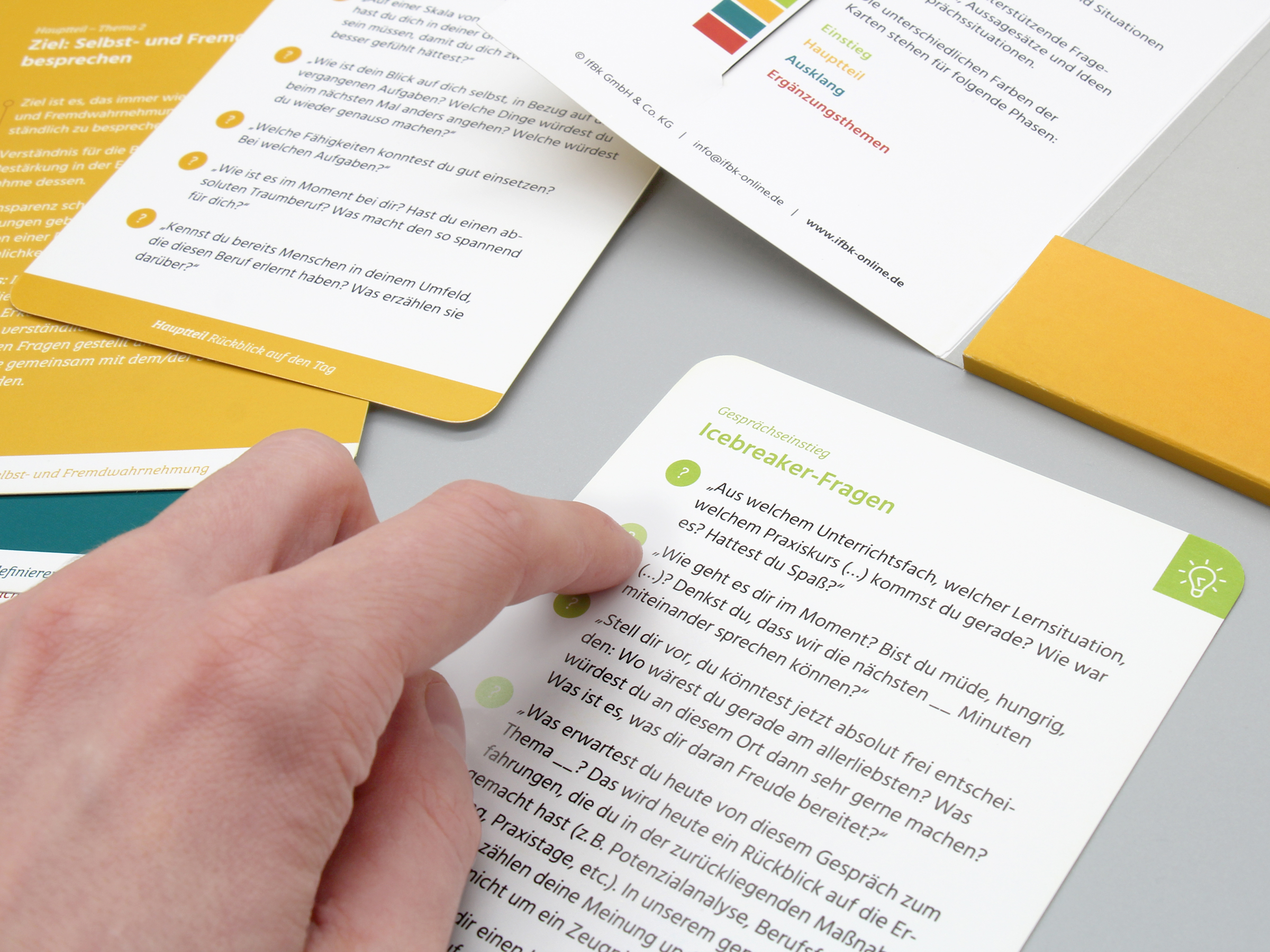 Zusätzliche Ergänzungsthemen geben Ihnen hilfreiche Impulse für herausfordernde Situationen: Jede Karte beschreibt eine mögliche Situation, die im Gespräch auftreten kann (z.B. schweigsame Schüler:innen). Auf der Rückseite finden Sie Ideen und Fragen, wie Sie mit der beschriebenen Situation umgehen können. Dank des handlichen Formats und der klaren Struktur lassen sich die Karten auch während des Gesprächs schnell und einfach einsetzen.